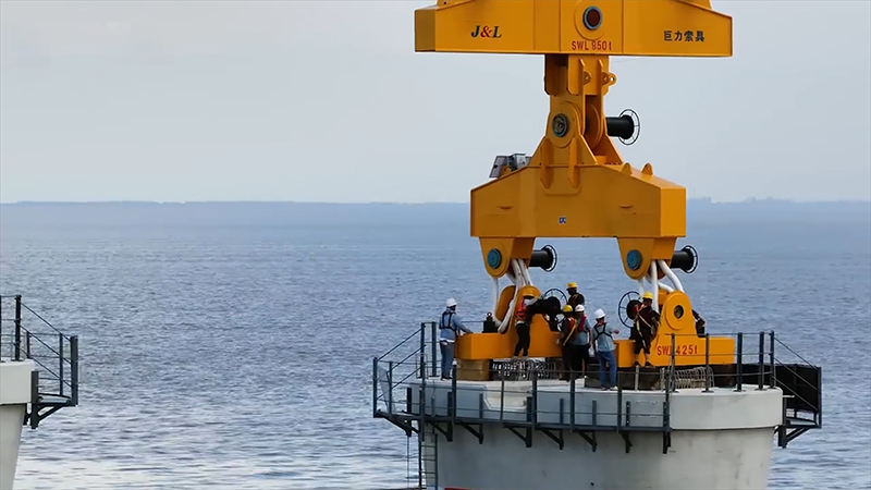 在杭州灣跨海鐵路橋中航道橋建設(shè)現(xiàn)場(chǎng),高7米,重達(dá)500噸的首節(jié)預(yù)制墩身節(jié)段在“盈尚1”起重船的吊裝下,被精準(zhǔn)架設(shè)到108號(hào)墩上,巨力索具再次為世界級(jí)工程項(xiàng)目添力!
