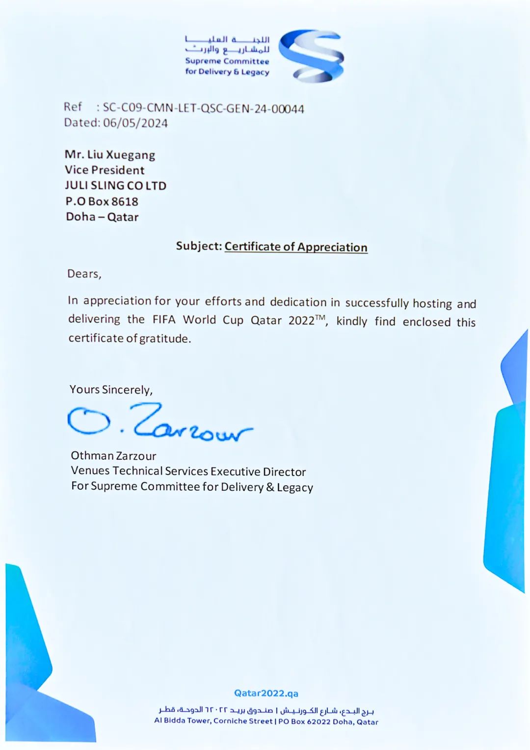 隨著2024年溫暖的春意,我們收到了來自項(xiàng)目業(yè)主——卡塔爾交付和遺產(chǎn)最高委員會(huì)(SUPREME COMMITTEE FOR DELIVERY & LEGACY)的感謝信及認(rèn)可證書,這是對(duì)我們過往努力的最佳肯定。信中的每一個(gè)字句,都是對(duì)我們團(tuán)隊(duì)辛勤工作和不懈努力的高度認(rèn)可。這份榮耀不僅屬于我們,也屬于每一位支持和關(guān)注我們項(xiàng)目的人。您們的信任和支持是我們最寶貴的財(cái)富,是我們不斷前進(jìn)的動(dòng)力源泉。