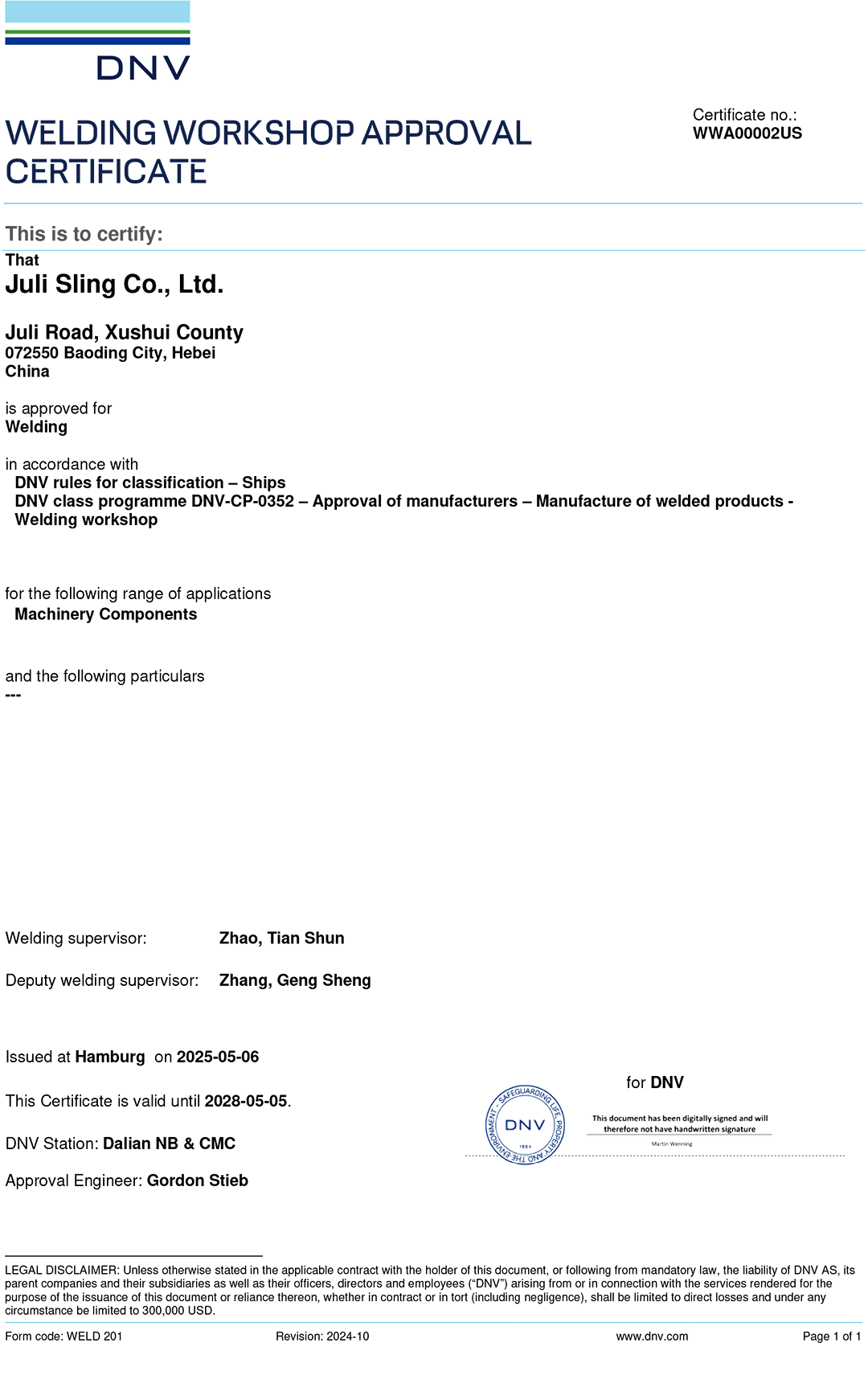 近日,巨力索具股份有限公司通過(guò)挪威船級(jí)社(DNV)嚴(yán)苛審核,正式斬獲DNV焊接工廠認(rèn)可證書(shū)!這是巨力索具在高端制造領(lǐng)域贏得的又一國(guó)際權(quán)威認(rèn)可。