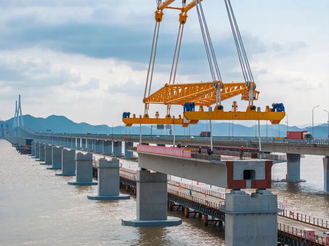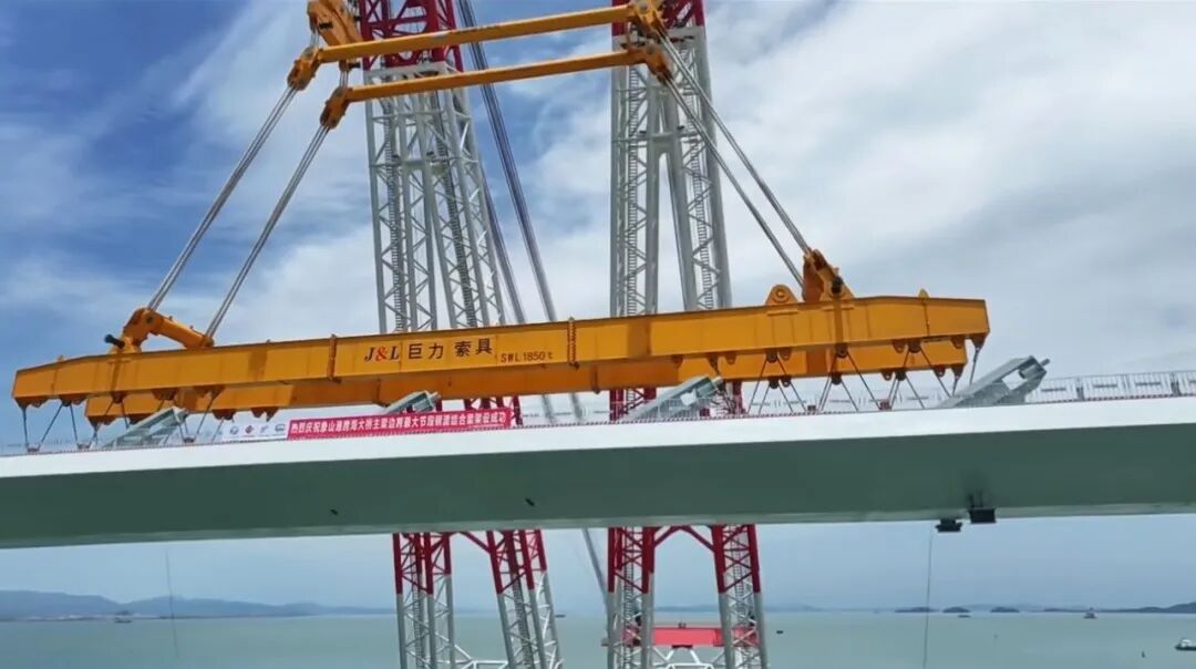 早在2024年11月,巨力索具便以定制化吊具助力該橋重達1700噸的首榀預(yù)制箱梁精準落位。該箱梁長60米、寬10.6米,是國內(nèi)市域鐵路工程中跨度最大、噸位最重的預(yù)應(yīng)力混凝土預(yù)制箱梁,橋面至海面距離最大約52米,接近20層樓高度,且毗鄰既有象山港公路大橋,操作空間狹小,對吊具穩(wěn)定性、吊裝精度和施工安全性要求極高。