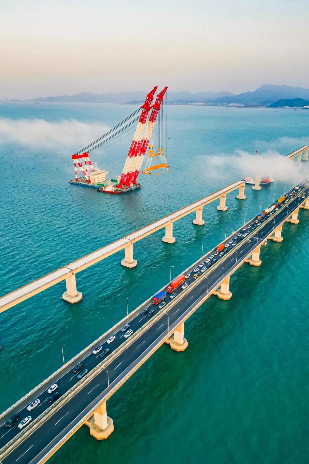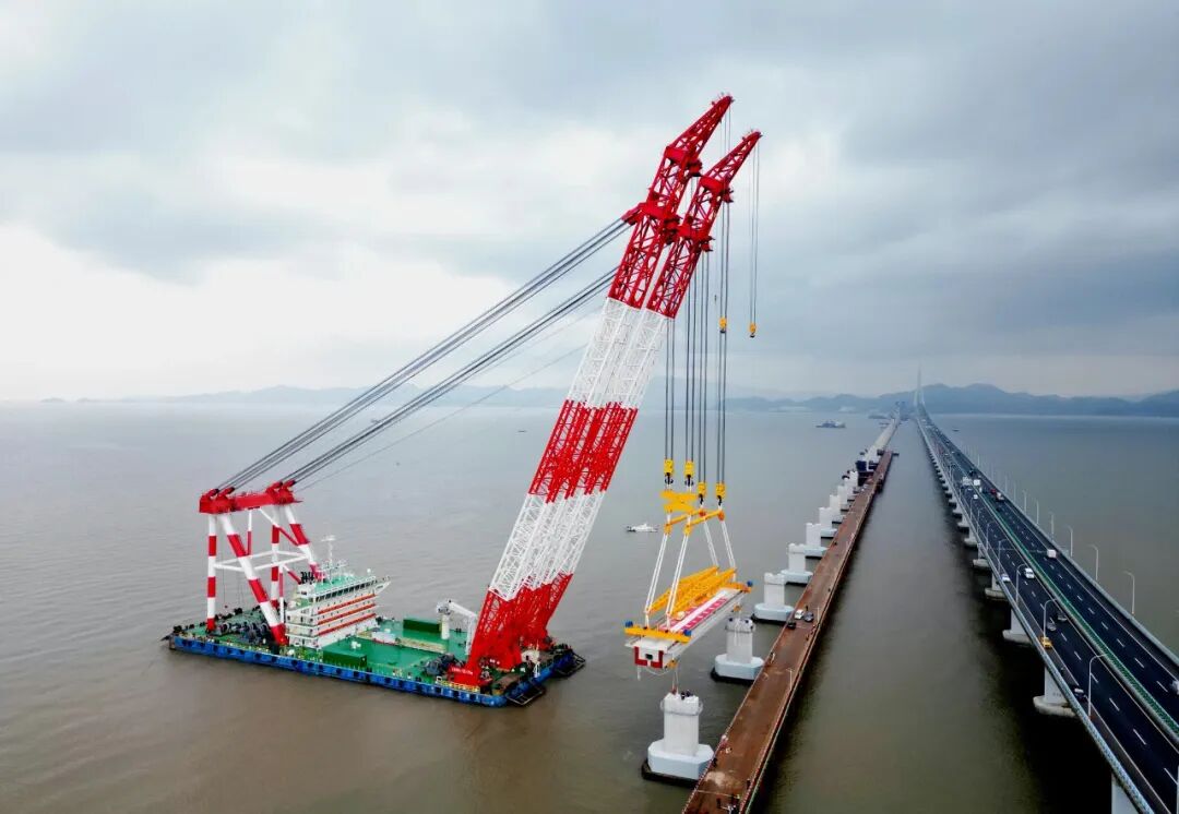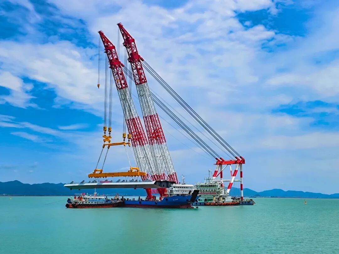 此次架設(shè)的鋼梁長107.5米,重約1779噸,加吊具總重2182噸,相當于1500輛家用轎車的重量,橋面至海面最大高度達53米(近20層樓高),鋼梁架設(shè)區(qū)域毗鄰既有象山港公路大橋,船舶站位緊鄰主航道,往來船只流量大,施工空間狹小、船舶通航密集,對吊裝精度與穩(wěn)定性提出嚴苛要求。