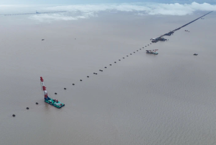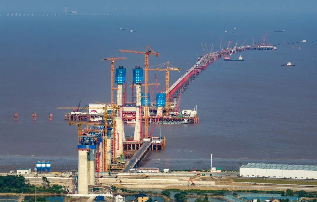 在杭州灣跨海鐵路橋中航道橋建設現場