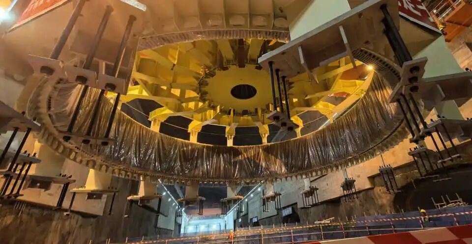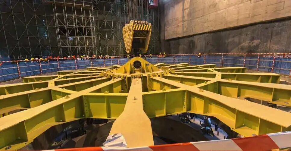 定子作為發(fā)電機(jī)組的重要核心部件,主要由機(jī)座、鐵芯和繞組三大部件組成。此次吊裝的定子外徑達(dá)16.4米,高5.6米,由22萬(wàn)張0.5毫米厚的硅鋼片疊裝而成,總重量達(dá)544.3噸。