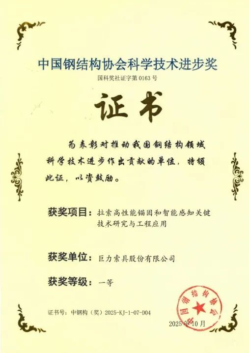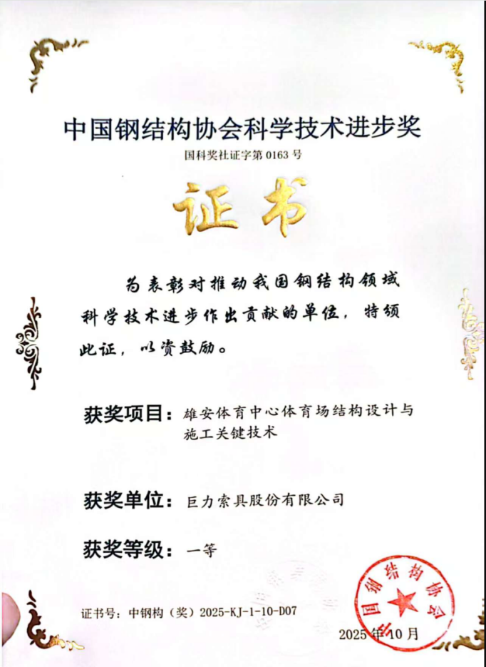 近日,2025年度中國(guó)鋼結(jié)構(gòu)協(xié)會(huì)科學(xué)技術(shù)進(jìn)步獎(jiǎng)評(píng)審結(jié)果揭曉。在10月14日于廣西南寧舉行的頒獎(jiǎng)典禮上,巨力索具股份有限公司憑借卓越的技術(shù)研發(fā)實(shí)力,一舉斬獲三項(xiàng)一等獎(jiǎng),充分彰顯了公司在高端索具技術(shù)領(lǐng)域的創(chuàng)新引領(lǐng)地位。