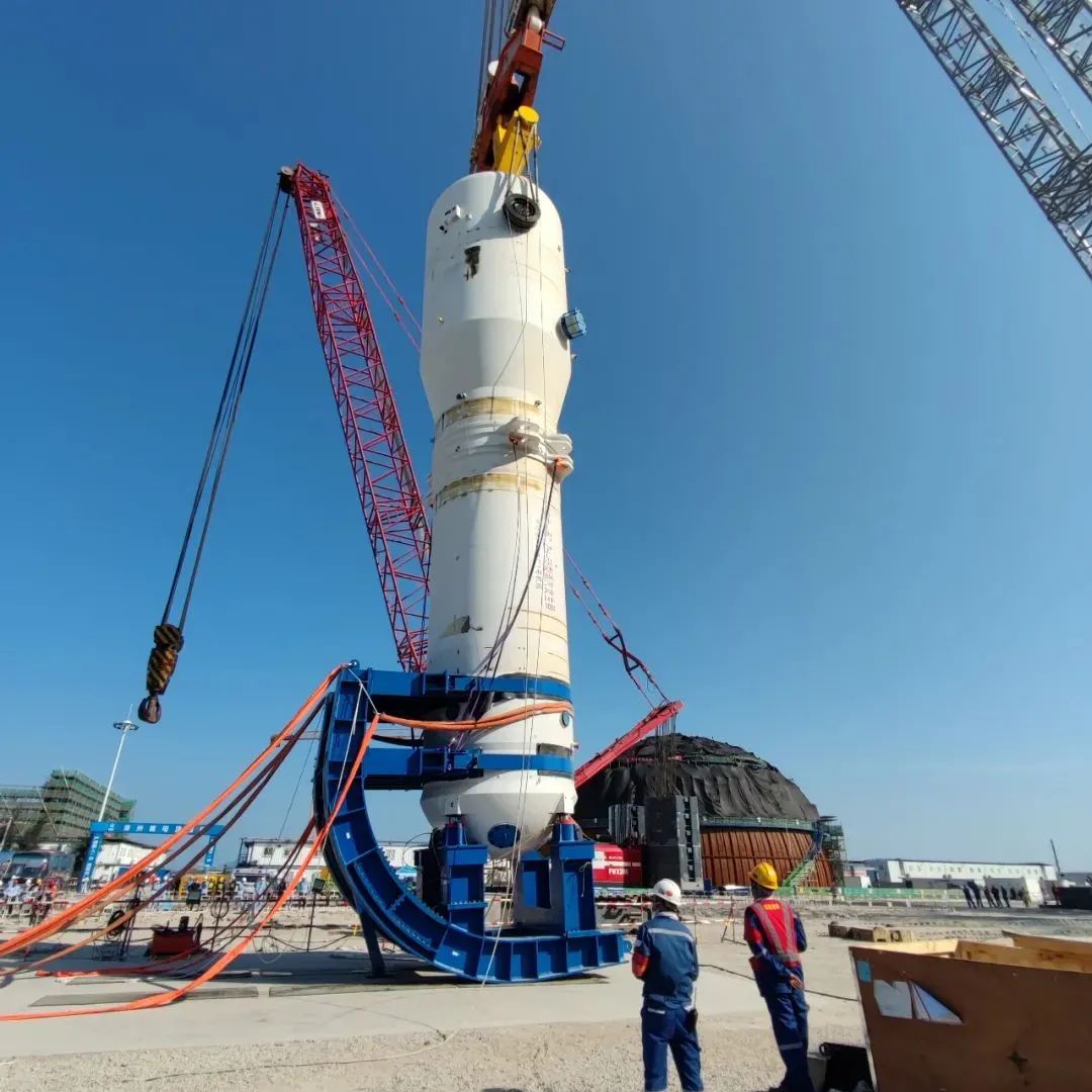 ZH-65型蒸汽發(fā)生器是華龍一號機(jī)組最核心的設(shè)備之一,它的體積巨大,結(jié)構(gòu)復(fù)雜而精細(xì),自接到吊裝任務(wù),巨力索具項(xiàng)目團(tuán)隊(duì)首先清晰形勢和任務(wù),統(tǒng)一大局意識和服務(wù)意識,明確各階段吊裝目標(biāo)和方向,吊裝方案采用新型翻轉(zhuǎn)裝置,該裝置利用重力和杠桿原理,無需特殊固定措施就能使主設(shè)備和翻轉(zhuǎn)支架形成一個(gè)整體,對比傳統(tǒng)的固定支架安裝調(diào)整以及安裝、拆卸抱環(huán)等工序,操作容易、安全性高,人因失誤概率低,極大提升了施工效率和安全。