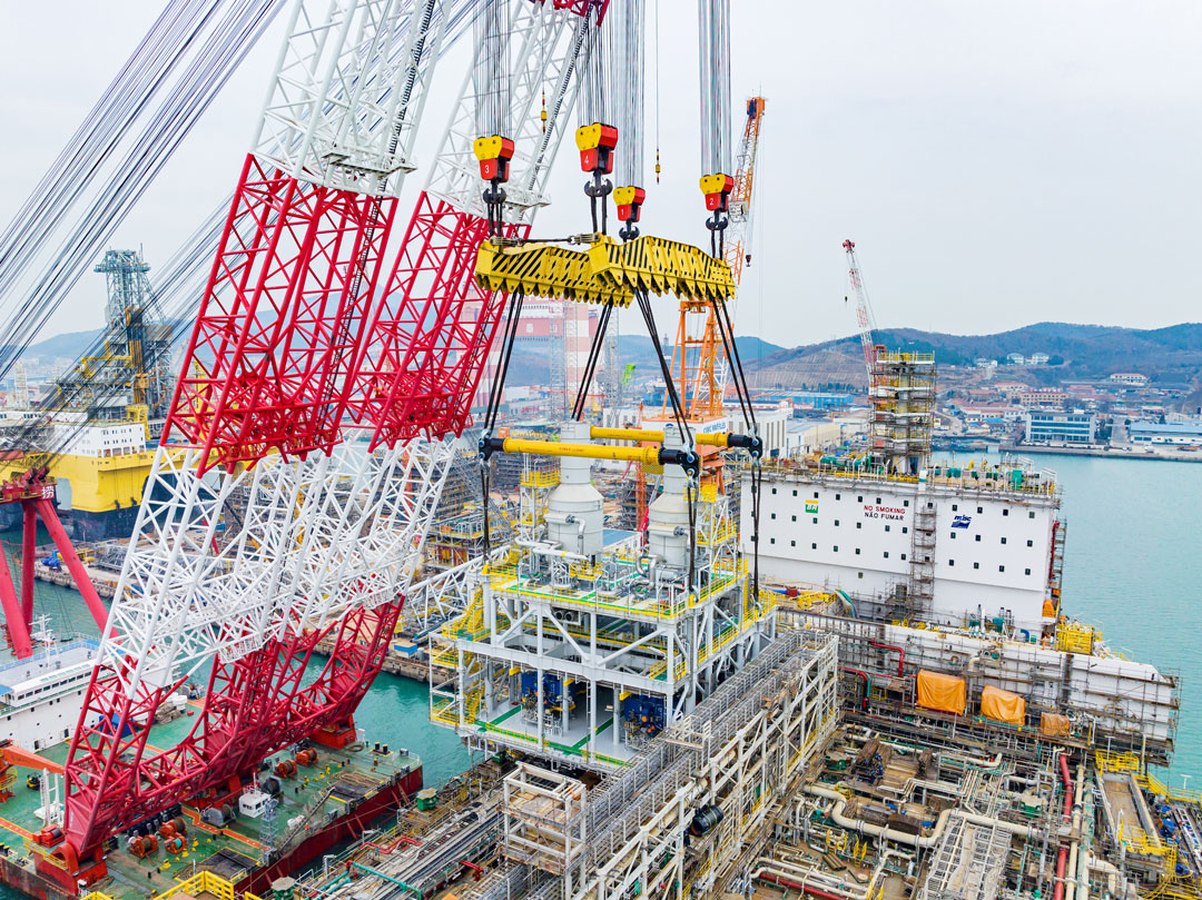 近日,中集來福士浮式生產(chǎn)儲(chǔ)油船(FPSO)重為3669噸的S20、2960噸的P60、2766噸的P20三大模塊吊裝完成。巨力索具為其提供了承載量為3000噸、2500噸的平衡梁梁式吊具、卸扣、無接頭繩索等產(chǎn)品,并為保證吊裝的順利進(jìn)行制訂了嚴(yán)謹(jǐn)?shù)牡跹b方案。